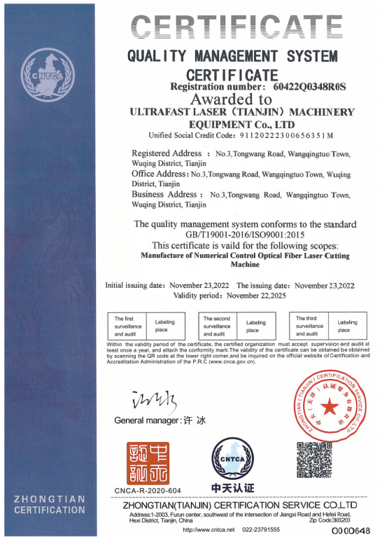 超快激光擁有一支專業從事激光切割設備研發設計的強大技術團隊,獲得多項實用型設計專利,已通過ISO9001質量管理體系認證證書,并且獲得國家頒發的高新技術企業證書。